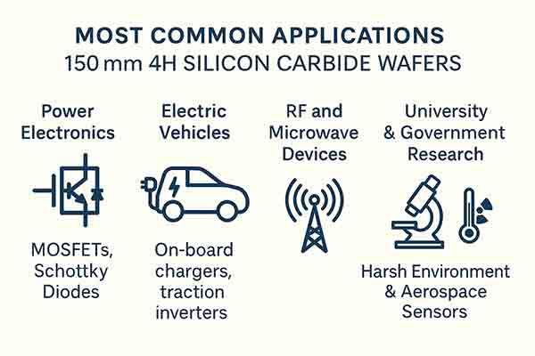 150mm 4H Silicon Carbide (SiC) wafers are most commonly used in high-power, high-frequency, and high-temperature applications due to their superior material properties, such as wide bandgap, high breakdown electric field, and excellent thermal conductivity.