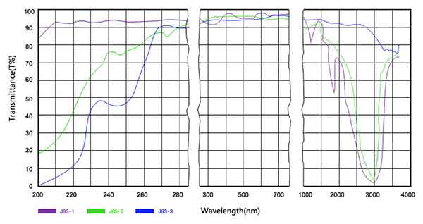 Residual impurities from the raw material affect Fused Quartz transparency in the ultraviolet. Such as JGS2,